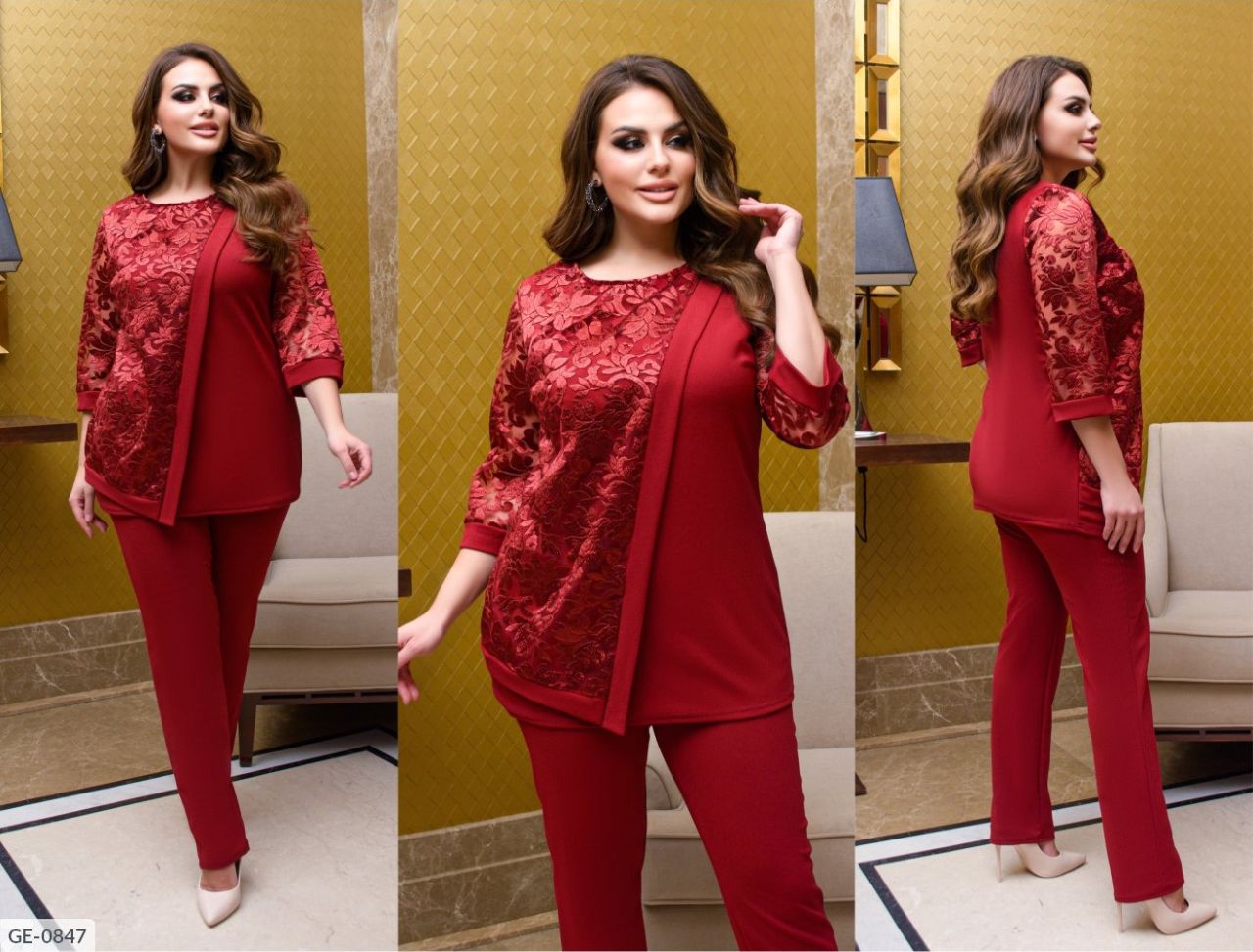 Колір: електрик, синій, бордо, чорний. Тканина: креп-дайвінг, вишивка на сітці (мереживо не значно може відрізнятися). . Довжина брюк 105 см, по внутрішньому шву 80 см. Довжина кофти 75 см, рукав 45 см. Вишуканий комплект складається з класичних брюк і блузи знахідка для сучасної жінки. Він універсальний, однаково доречний в офісі і на світському прийомі. Розкішне мереживо прикрашає передню частину Блузи і рукава, мимоволі притягуючи погляди. Напівкруглий виріз і відсутність коміра оголюють шию, підкреслюючи її граціозність. Наряд, який однозначно підкорить вас і стане улюбленцем в гардеробі! Замір: Розмір 50-52. Блуза 75 см., рукав - 43 см. Ог-110 см. Штани 105 см, об-114 см. Розмір 54-56. Блуза 80 см., рукав - 44 см. Ог-116 см. Штани 106 см, об-122 см. Розмір 58-60. Блуза 85 см, рукав 46 ог-120 см. Штани 107 см, об-126 см