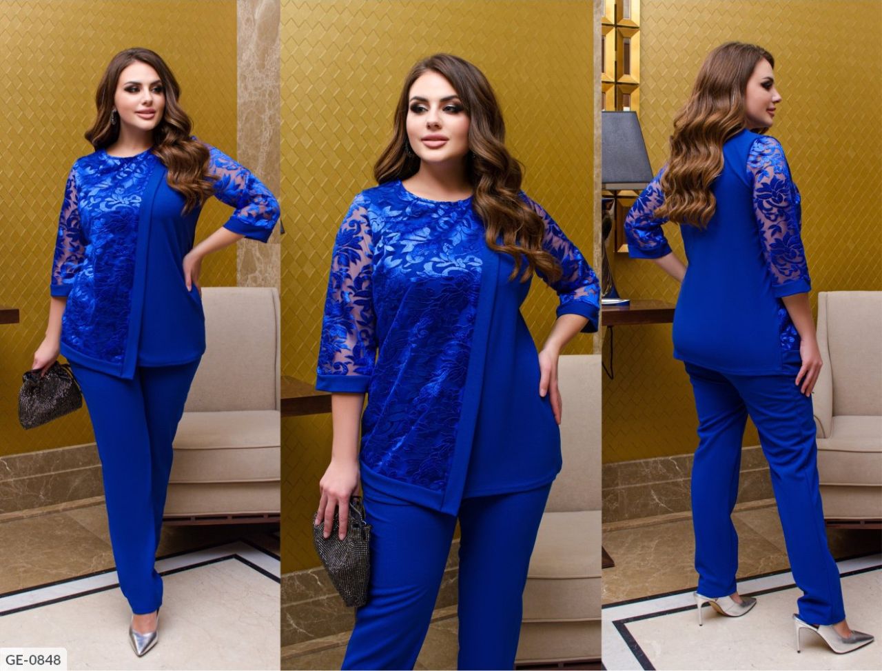Колір: електрик, синій, бордо, чорний. Тканина: креп-дайвінг, вишивка на сітці (мереживо не значно може відрізнятися). . Довжина брюк 105 см, по внутрішньому шву 80 см. Довжина кофти 75 см, рукав 45 см. Вишуканий комплект складається з класичних брюк і блузи знахідка для сучасної жінки. Він універсальний, однаково доречний в офісі і на світському прийомі. Розкішне мереживо прикрашає передню частину Блузи і рукава, мимоволі притягуючи погляди. Напівкруглий виріз і відсутність коміра оголюють шию, підкреслюючи її граціозність. Наряд, який однозначно підкорить вас і стане улюбленцем в гардеробі! Замір: Розмір 50-52. Блуза 75 см., рукав - 43 см. Ог-110 см. Штани 105 см, об-114 см. Розмір 54-56. Блуза 80 см., рукав - 44 см. Ог-116 см. Штани 106 см, об-122 см. Розмір 58-60. Блуза 85 см, рукав 46 ог-120 см. Штани 107 см, об-126 см