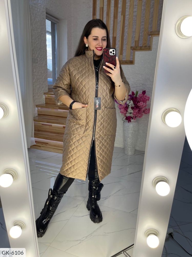 Тканина-стьобана плащівка на синтепоні, підклад. Візерунок-ромб Кольори-червоний, синій, капучіно, чорний Чорний колір +64,65,66 Подовжене пальто на синтепоні, рукав нижче ліктя (довжина три чверті) , застібається на змійку з двома бігунками, з боків глибокі кишені, комір стійка. Підійде під штани, плаття, костюм, спідницю, взуття спорт або класика. Лосини так само в продажу На параметри клієнта ог110, от90, об112 підійде 52-й. Параметри по зовнішньому шву куртки (так як пальто на синтепоні, орієнтуйтеся на параметри клієнта): 48-й: ог114, от114, об116, рукав від горловини 52см, довжина по спинці 100см. 50-й: ог116, от116, об118, рукав від горловини 54см, довжина по спинці 102см, біцепс 42см. 52-й: ог118, от118, об120, рукав від горловини 50см, довжина 103см, 54-й: ог120, от120, об122, рукав від горловини 50см, довжина 104см, 56-й: ог126, от126, об128, рукав від горловини 53см, довжина 104см, 58-й: ог132, от130, об134, рукав від горловини 54см, довжина по спинці 105см, 60-й: ог140, от140, об142, рукав від горловини 57см, довжина 106см, 62-й: ог144, от146, об 148, рукав від горловини 55см, довжина по спинці 108см. 64: ог148,от150( верх кишені), об156( низ кишені), біцепс 50см, довжина по спинці 112см 66-й: ог152, от152( верх кишені), об158( низ кишені), біцепс 50, довжина 112 68-й: ог158, от156, об164, біцепс 52, довжина 114