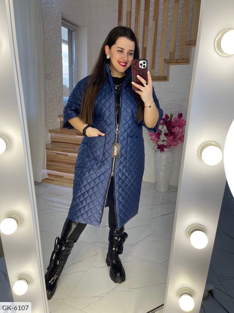 Тканина-стьобана плащівка на синтепоні, підклад. Візерунок-ромб Кольори-червоний, синій, капучіно, чорний Чорний колір +64,65,66 Подовжене пальто на синтепоні, рукав нижче ліктя (довжина три чверті) , застібається на змійку з двома бігунками, з боків глибокі кишені, комір стійка. Підійде під штани, плаття, костюм, спідницю, взуття спорт або класика. Лосини так само в продажу На параметри клієнта ог110, от90, об112 підійде 52-й. Параметри по зовнішньому шву куртки (так як пальто на синтепоні, орієнтуйтеся на параметри клієнта): 48-й: ог114, от114, об116, рукав від горловини 52см, довжина по спинці 100см. 50-й: ог116, от116, об118, рукав від горловини 54см, довжина по спинці 102см, біцепс 42см. 52-й: ог118, от118, об120, рукав від горловини 50см, довжина 103см, 54-й: ог120, от120, об122, рукав від горловини 50см, довжина 104см, 56-й: ог126, от126, об128, рукав від горловини 53см, довжина 104см, 58-й: ог132, от130, об134, рукав від горловини 54см, довжина по спинці 105см, 60-й: ог140, от140, об142, рукав від горловини 57см, довжина 106см, 62-й: ог144, от146, об 148, рукав від горловини 55см, довжина по спинці 108см. 64: ог148,от150( верх кишені), об156( низ кишені), біцепс 50см, довжина по спинці 112см 66-й: ог152, от152( верх кишені), об158( низ кишені), біцепс 50, довжина 112 68-й: ог158, от156, об164, біцепс 52, довжина 114