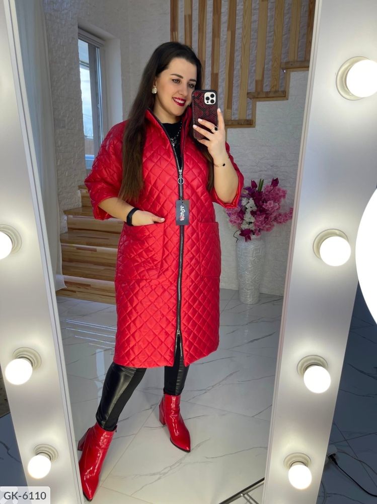 Тканина-стьобана плащівка на синтепоні, підклад. Візерунок-ромб Кольори-червоний, синій, капучіно, чорний Чорний колір +64,65,66 Подовжене пальто на синтепоні, рукав нижче ліктя (довжина три чверті) , застібається на змійку з двома бігунками, з боків глибокі кишені, комір стійка. Підійде під штани, плаття, костюм, спідницю, взуття спорт або класика. Лосини так само в продажу На параметри клієнта ог110, от90, об112 підійде 52-й. Параметри по зовнішньому шву куртки (так як пальто на синтепоні, орієнтуйтеся на параметри клієнта): 48-й: ог114, от114, об116, рукав від горловини 52см, довжина по спинці 100см. 50-й: ог116, от116, об118, рукав від горловини 54см, довжина по спинці 102см, біцепс 42см. 52-й: ог118, от118, об120, рукав від горловини 50см, довжина 103см, 54-й: ог120, от120, об122, рукав від горловини 50см, довжина 104см, 56-й: ог126, от126, об128, рукав від горловини 53см, довжина 104см, 58-й: ог132, от130, об134, рукав від горловини 54см, довжина по спинці 105см, 60-й: ог140, от140, об142, рукав від горловини 57см, довжина 106см, 62-й: ог144, от146, об 148, рукав від горловини 55см, довжина по спинці 108см. 64: ог148,от150( верх кишені), об156( низ кишені), біцепс 50см, довжина по спинці 112см 66-й: ог152, от152( верх кишені), об158( низ кишені), біцепс 50, довжина 112 68-й: ог158, от156, об164, біцепс 52, довжина 114