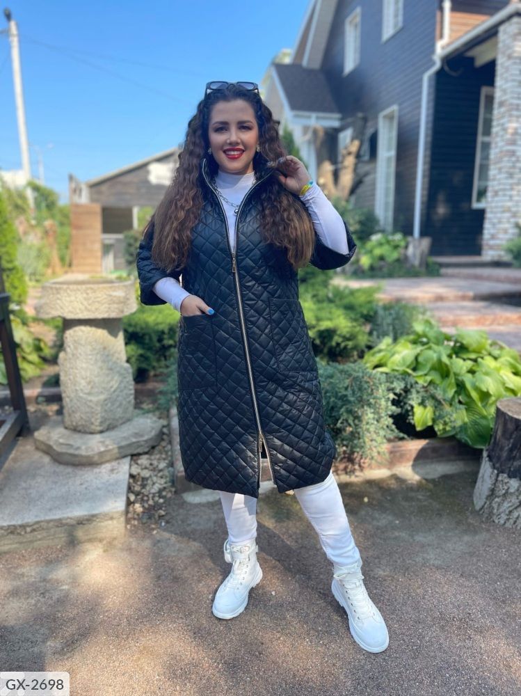 Подовжене пальто на синтепоні, рукав нижче ліктя (довжина 3/4), застібається на застібку з двома бігунками, з боків глибокі кишені, комір-стійка