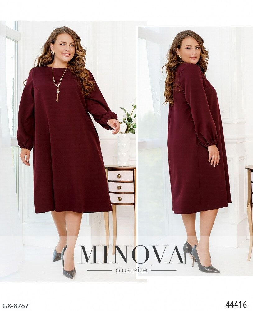 Матеріал: костюмка Колір: бордо Розтяжність: слабка розтяжність (0-1см) сукня з напівкруглим широким вирізом горловини. З боків-кишені в шві. Рукав вільний, на зап'ясті призібраний гумкою, без манжета. Застібок немає. На грудях діагональні виточки. Прикраса входить в комплект. Орієнтовні заміри по готовому виробу: 50-52 р-р: довжина сукні 106см, довжина рукава від плечового шва 56см, обхват рукава 38см, ог - 104см, від-108см, про-116см. 54-56 р-р: довжина сукні 107см, довжина рукава від плечового шва 57см, обхват рукава 40см, ог - 112см, від-116см, про-124см. 58-60 р-р: довжина сукні 108см, довжина рукава від плечового шва 58см, обхват рукава 42см, ог - 120см, від-124см, про-138см. 62-64 р-р: довжина сукні 109см, довжина рукава від плечового шва 59см, обхват рукава 44см, ог - 128см, від-132см, про-146см. 66-68 р-р: довжина сукні 110см, довжина рукава від плечового шва 60см, обхват рукава 46см, ог - 136см, від-140см, про-154см.