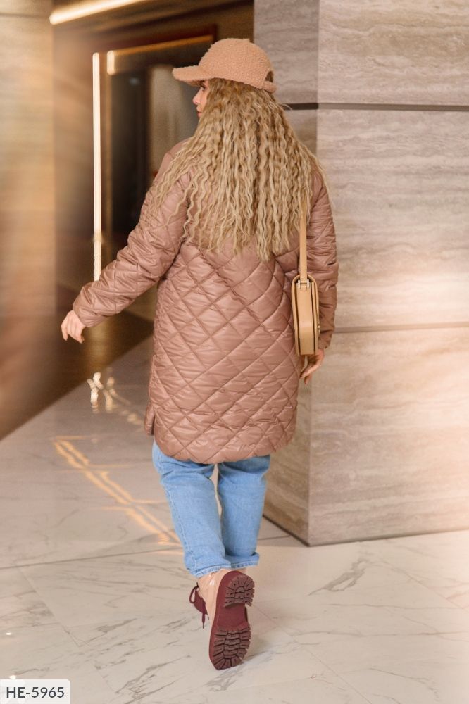Стьобана куртка середньої довжини з високим коміром і довгими рукавами. Виріб застібається на ряд кнопок на планочці. З боків об'ємні накладні кишені. Поділ закруглений і доповнений бічними розрізами.