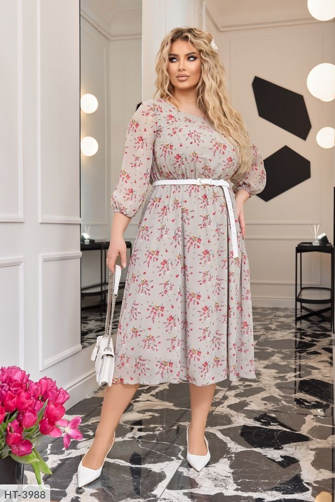 Це повітряне плаття зроблено з легкого шифону в квітковий принт. Воно має напівкруглий виріз горловини і відрізну лінію талії, яка спадає плісированими оборками, надаючи сукні легкості і грації. Сукня складається з двох шарів тканини, де верхній шар є напівпрозорим шифоном, а нижній шар м'який і приємний на дотик.