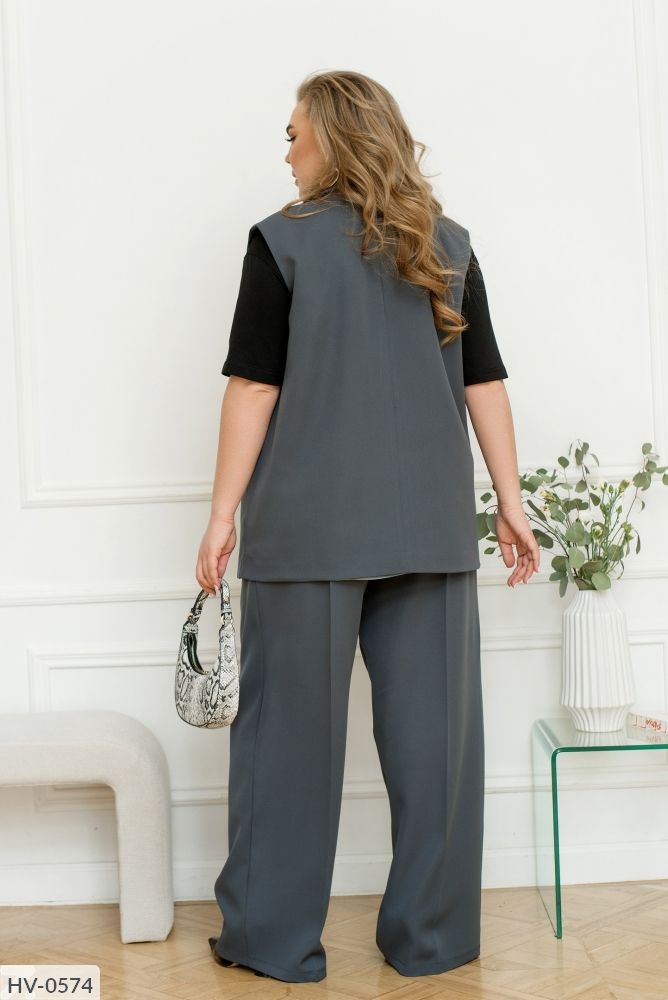 Двобортний жилет класичного крою має дуже стильний і елегантний вигляд. Ця модель ідеально поєднується зі штанами палаццо, створюючи комплект, який підкреслить ваш стиль і вишуканість. Добре тримає форму завдяки додатковому шару дублерина, такий спосіб застосовується для ущільнення тканини і зміцнення деталей піджака. Застібається на два гудзики і має підкладку. Так само має кишені для дрібниць (зверніть увагу, що кишені прошиті, перед використанням потрібно їх розрізати). Комбінуй жилет з іншими речами свого гардеробу для створення унікального стилю. Цей образ підійде як для робочих зустрічей, так і для інших важливих подій.
