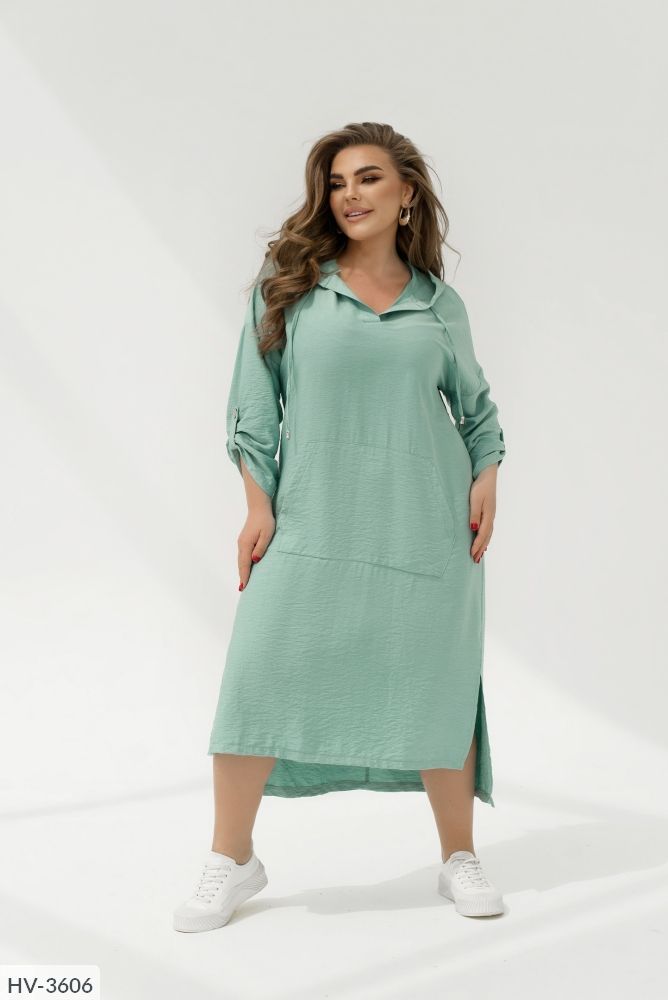 Сучасне і стильне плаття спортивного крою довжини максі зі спущеними плечима. Сукня вільного крою в стилі оверсайз з довгим рукавом, який доповнений не функціональної шлеєю на гудзику. Ми зробили не великий виріз горловини v-форми, який переходить в капюшон. Дизайнери додали велику функціональну кишеню на передню частину сукні. Сукня подовжена по спинці, а по бічній частині Подолу ми зробили розрізи які додають легкості образу.