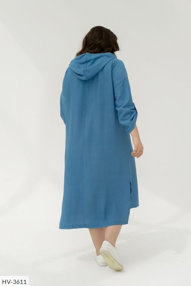 Сучасне і стильне плаття спортивного крою довжини максі зі спущеними плечима. Сукня вільного крою в стилі оверсайз з довгим рукавом, який доповнений не функціональної шлеєю на гудзику. Ми зробили не великий виріз горловини v-форми, який переходить в капюшон. Дизайнери додали велику функціональну кишеню на передню частину сукні. Сукня подовжена по спинці, а по бічній частині Подолу ми зробили розрізи які додають легкості образу.