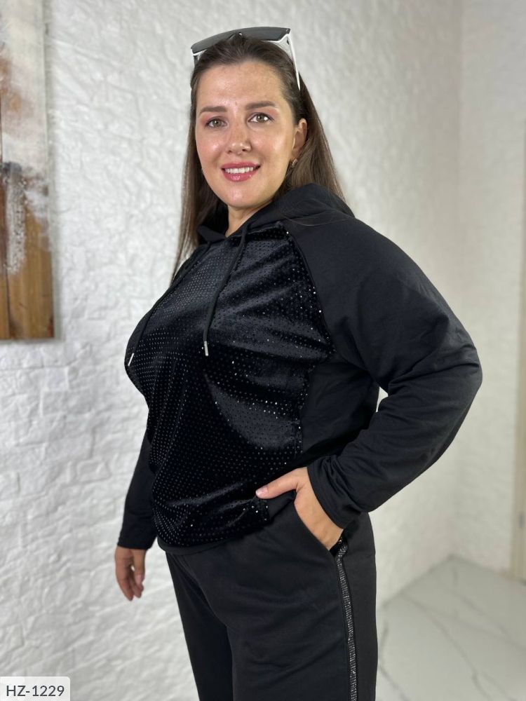 Колір: Чорний Тканина: Двухнитка хорошої якості, не кошлатиться, не линяє, На грудях Тканина велюр + блискітки Костюм-двійка з двуніткі дуже хорошої якості, яка не покошлатится і не злиняє, буде служити багато років. Кофта з цікавою обробкою у вигляді вивернутих швів, капюшон на канатику з срібним фіксатором Штани з резинкою на талії і по низу брюк, з обох сторін красивий лампас з блискітками хорошої якості Параметри моделі-норми ОГ 104, ОТ 80, ОС 106, зріст 170 см, на ній розмір 46-48, параметри моделі-батал ОГ 108, ОТ 86, ОС 112, зріст 165см, на ній розмір 50-52. Параметри по зовнішньому шву: Розмір 46-48 Кофта Об'єм грудей 120 Об'єм талії 110 Довжина рукава від горловини 68 Довжина по спинці 72 Штани Об'єм талії 74-94 Обсяг стегон 112 Довжина по зовнішньому шву 100 Довжина по внутрішньому шву 71 Розмір 50-52 Кофта Об'єм грудей 126 Об'єм талії 116 Довжина рукава від горловини 70 Довжина по спинці 72 Штани Об'єм талії 76-96 Обсяг стегон 116 Довжина по зовнішньому шву 100 Довжина по внутрішньому шву 71 Розмір 54-56 Кофта Об'єм грудей 132 Обсяг талії 122 Довжина рукава від горловини 74 Довжина по спинці 72 Штани Об'єм талії 80-100 Обсяг стегон 120 Довжина по зовнішньому шву 105 Довжина по внутрішньому шву 74 Розмір 58-60 Кофта Об'єм грудей 140 Об'єм талії 130 Довжина рукава від горловини 77 Довжина по спинці 73 Штани Об'єм талії 86-106 Обсяг стегон 136 Довжина по зовнішньому шву 107 Довжина по внутрішньому шву 75 Розмір 62-64 Кофта Об'єм грудей 148 Об'єм талії 138 Довжина рукава від горловини 78 Довжина по спинці 74 Штани Об'єм талії 92-112 Обсяг стегон 148 Довжина по зовнішньому шву 109 Довжина по внутрішньому шву 76
