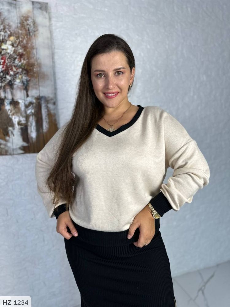 Костюм-двійка: кофта з v-подібним вирізом, горловина і манжети рубчика, низ кофти на манжеті з ангори, спідниця з рубчика, на широкій резинці, з одного боку розріз.