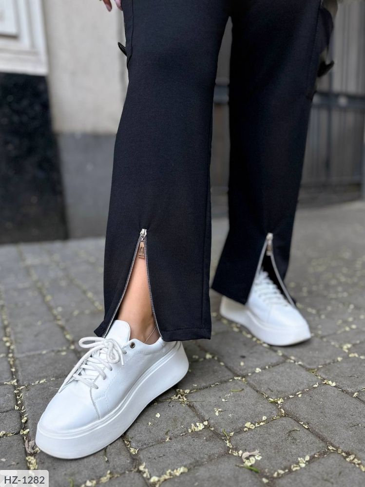 Костюм-двійка: комбінована кофта з двома, робочими блискавками, низ кофти вільний, по низу є резинка і фіксатор, можна регулювати обсяг Кофти, Штани на резинці, з боків дві кишені, на колінах два робочих кишені з шкіряними вставками + гудзик на ніжці, по низу брюк блискавки, які можна растегнуть.