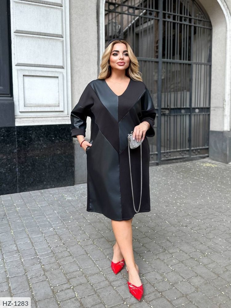 Тканина: Дайвінг, екошкіра Колір: Чорний Вільне плаття, спущений рукав нижче ліктя, комбіноване плаття, з боків кишені, ззаду розріз. Параметри моделі-норми ОГ 95, ОТ 60, ОС 95, зріст 170см, на ній одягнений 46-48, параметри моделі-батал ОГ 110, ОТ 86, ОС 110, зріст 165см, на ній одягнений 50-52. Заміри виробу: Розмір 46-48: Об'єм грудей 120 Об'єм талії 112 Обсяг стегон 114 Довжина рукава від горловини 59 Довжина сукні по спинці 109 Біцепс 48 Розмір 50-52: Об'єм грудей 130 Об'єм талії 120 Обсяг стегон 126 Довжина рукава від горловини 60 Довжина сукні по спинці 111 Біцепс 50 Розмір 54-56: Об'єм грудей 138 Об'єм талії 128 Обсяг стегон 136 Довжина рукава від горловини 64 Довжина сукні по спинці 111 Біцепс 51 Розмір 58-60: Об'єм грудей 150 Об'єм талії 140 Обсяг стегон 146 Довжина рукава від горловини 66 Довжина сукні по спинці 112 Біцепс 54 Розмір 62-64: Об'єм грудей 158 Об'єм талії 150 Обсяг стегон 156 Довжина рукава від горловини 67 Довжина сукні по спинці 112 Біцепс 58 Розмір 66-68: Об'єм грудей 174 Об'єм талії 160 Обсяг стегон 166 Довжина рукава від горловини 68 Довжина сукні по спинці 112 Біцепс 58