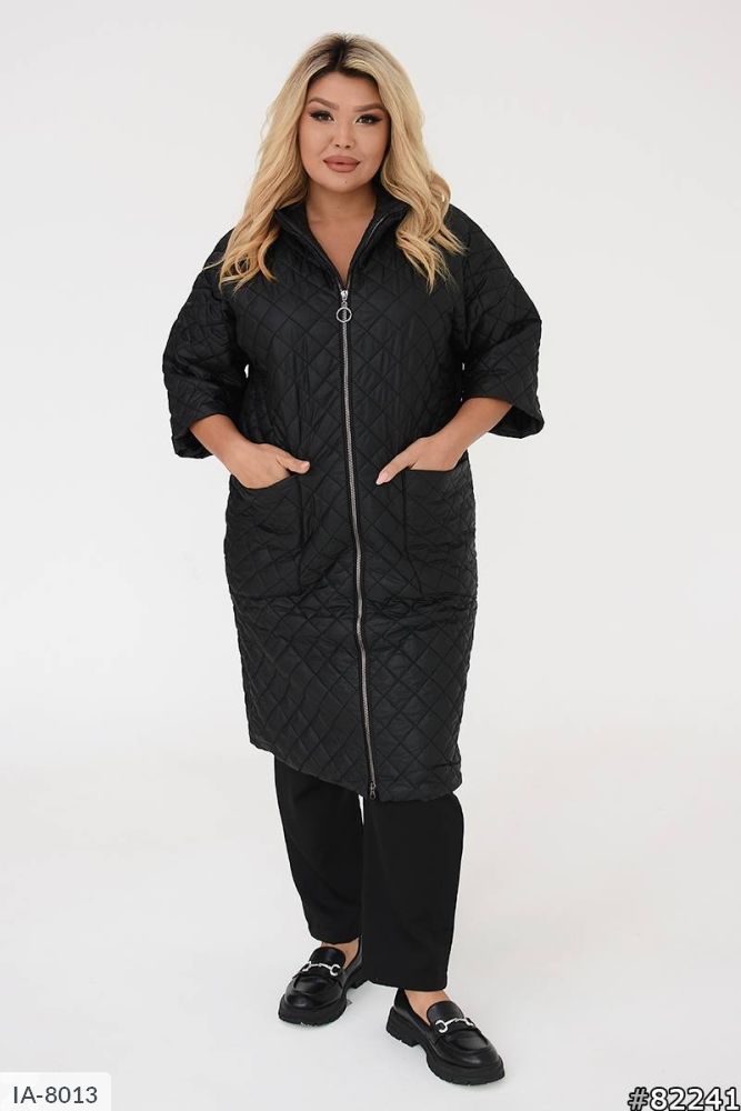 Подовжене пальто на синтепоні, рукав нижче ліктя (довжина 3/4), застібається на застібку з двома бігунками, з боків глибокі кишені, комір-стійка.