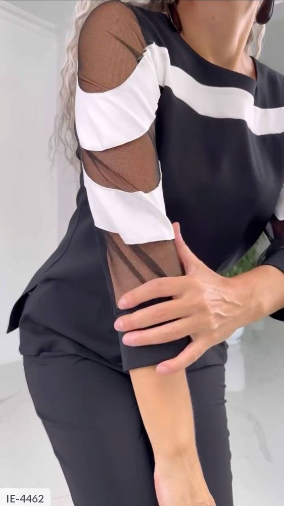 Тканина: крепкостюмка, евросетка Колір: Чорний Ошатний костюм-двійка: блуза цікавого крою: декоративні смужки з сітки і білої тканини красиво поєднуються в хвилі, які переходять на рукава. Така цікава деталь підкреслить вашу фігуру і додасть елегантності образу. По спинці потайна блискавка, з боків два розрізи, рукава нижче ліктя на манжеті. Штани фіксуються гудзиком і блискавкою, ззаду резинка на талії, з боків дві кишені