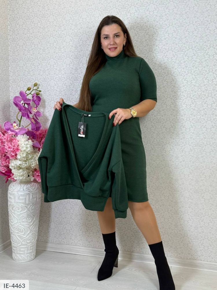 Тканина: щільна ангора арктика (тепла, приємна на дотик, щільна ) Кольори: шоколад меланж, пляшка, чорний, сірий Комплект: сукня нижче колін, короткий рукав, горловина стійка, кофта вільного крою за запах, красиво прикриває животик, по низу широка манжета, довгий рукав на манжеті