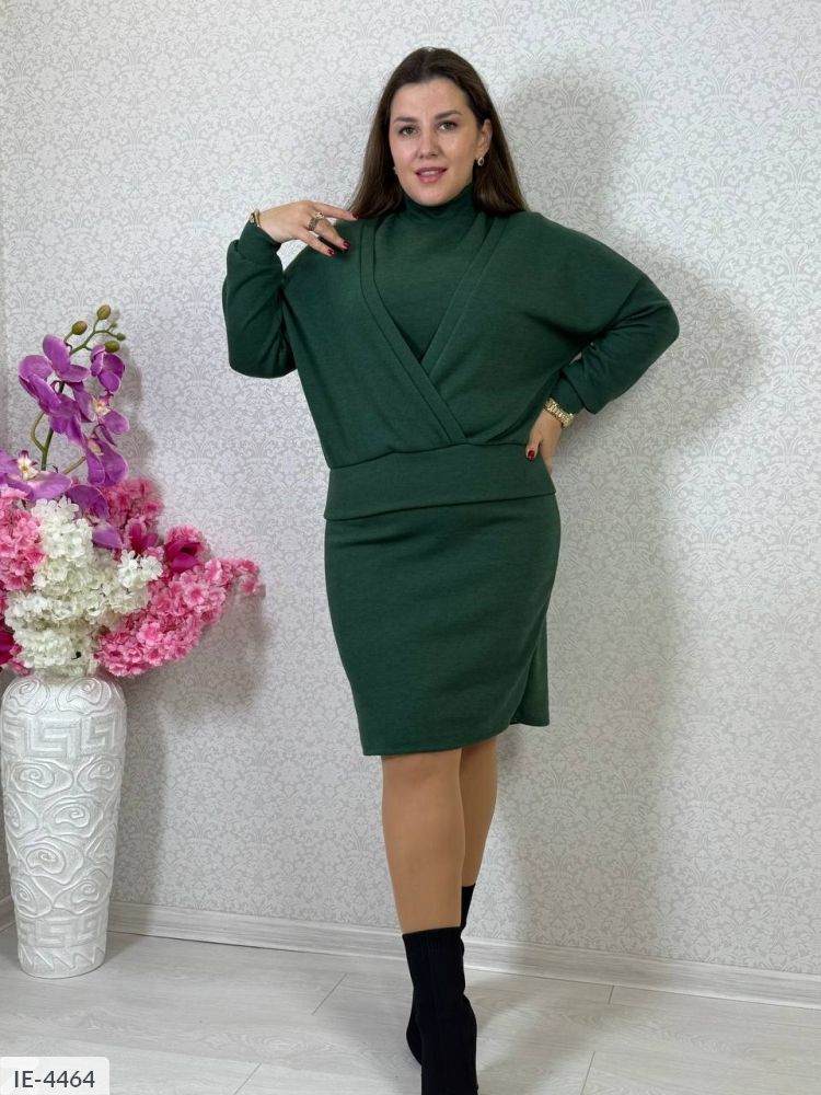 Комплект: сукня нижче колін, короткий рукав, горловина стійка, кофта вільного крою за запах, красиво прикриває животик, по низу широка манжета, довгий рукав на манжеті