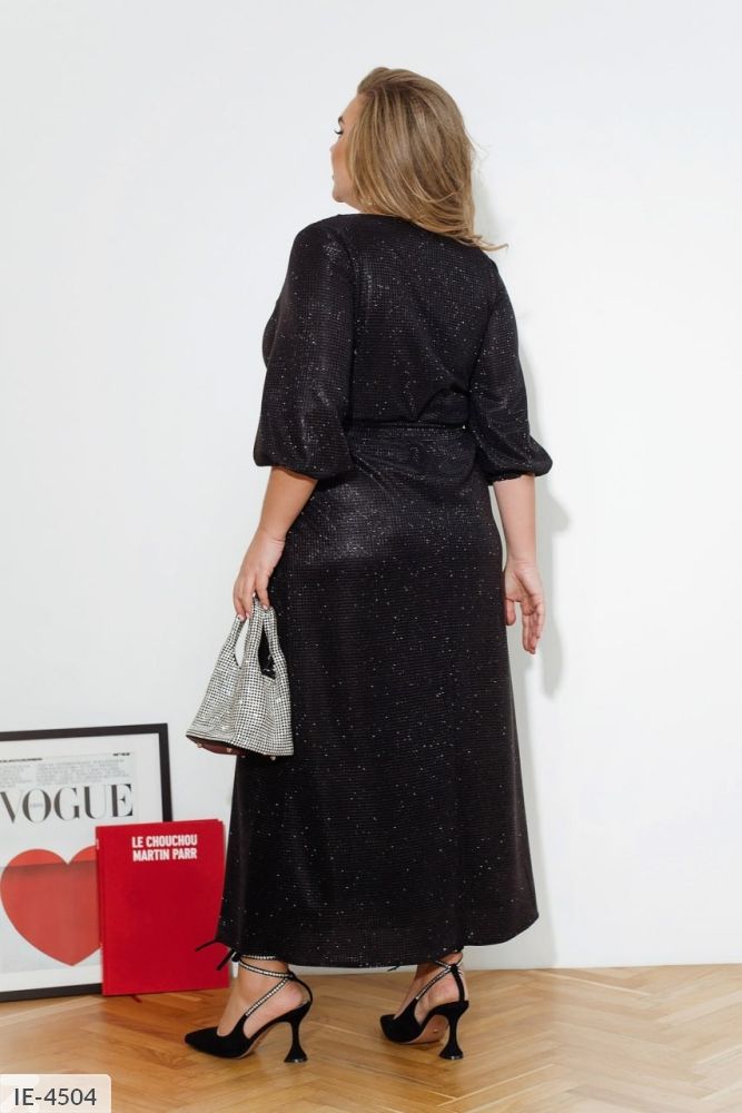 Святкове максі-плаття, яке стане справжнім втіленням розкоші і стилю! Вся модель сяє завдяки розкішним блискіткам, привертаючи увагу з першого погляду. Зручні рукава три чверті на резинці додають практичності, а неглибокий v-подібний виріз горловини підкреслює жіночність і витонченість. Спинка оброблена елегантним швом уздовж всієї довжини, що надає сукні ще більше вишуканості. Для максимального комфорту модель оснащена трикотажною підкладкою. У комплекті йде текстильний пояс, що допоможе вигідно акцентувати талію. Це плаття стане ідеальним вибором для святкових подій, де ви прагнете виглядати бездоганно.
