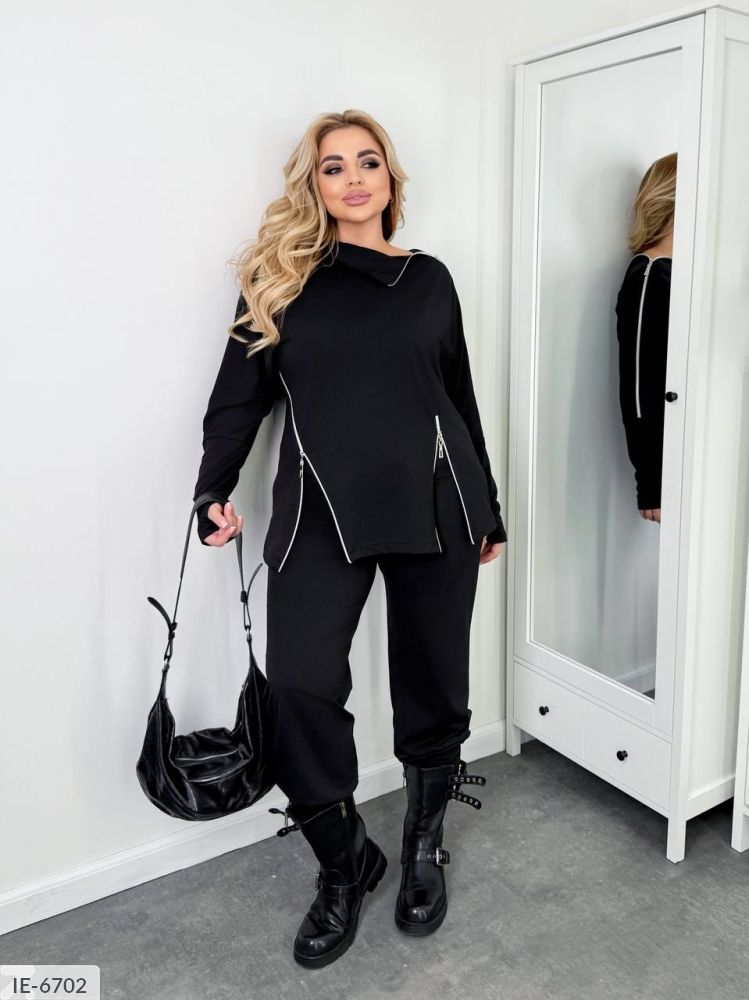 Костюм-двійка: кофта цікавого крою з робочими блискавками: по низу блискавки додають обсяг, на рукаві блискавка до горловини, можна растегнуть і додати цікавої деталі на плечі, на рукавах є метинка( дірочка для пальчика), штани вільного крою: на широкій резинці, з боків дві кишені, по низу дві робочі блискавки