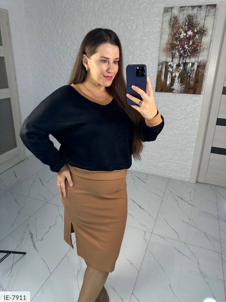 Костюм-двійка: кофта з v-подібним вирізом, горловина і манжети рубчика, низ кофти на манжеті з ангори, спідниця з рубчика, на широкій резинці, з одного боку розріз.