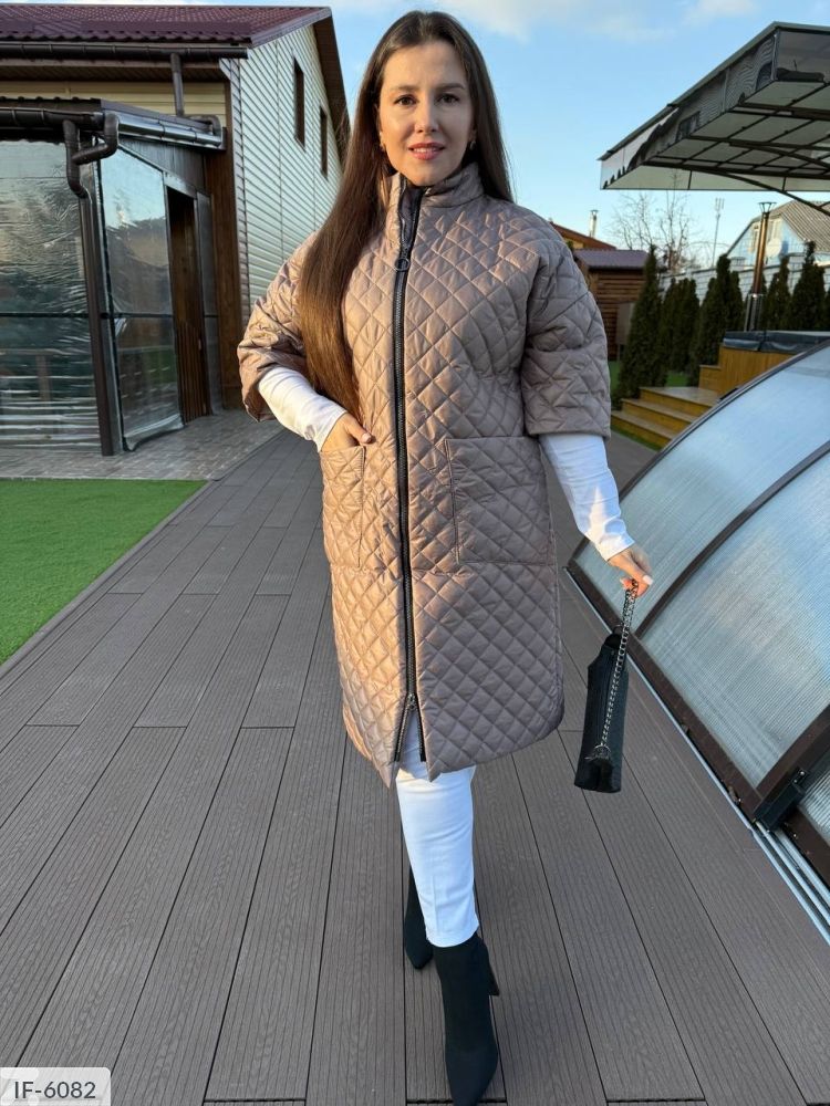 Подовжене пальто на синтепоні, рукав нижче ліктя (довжина 3/4), застібається на застібку з двома бігунками, з боків глибокі кишені, комір-стійка, підійде під штани, плаття, костюм, спідницю, взуття спорт або класика.