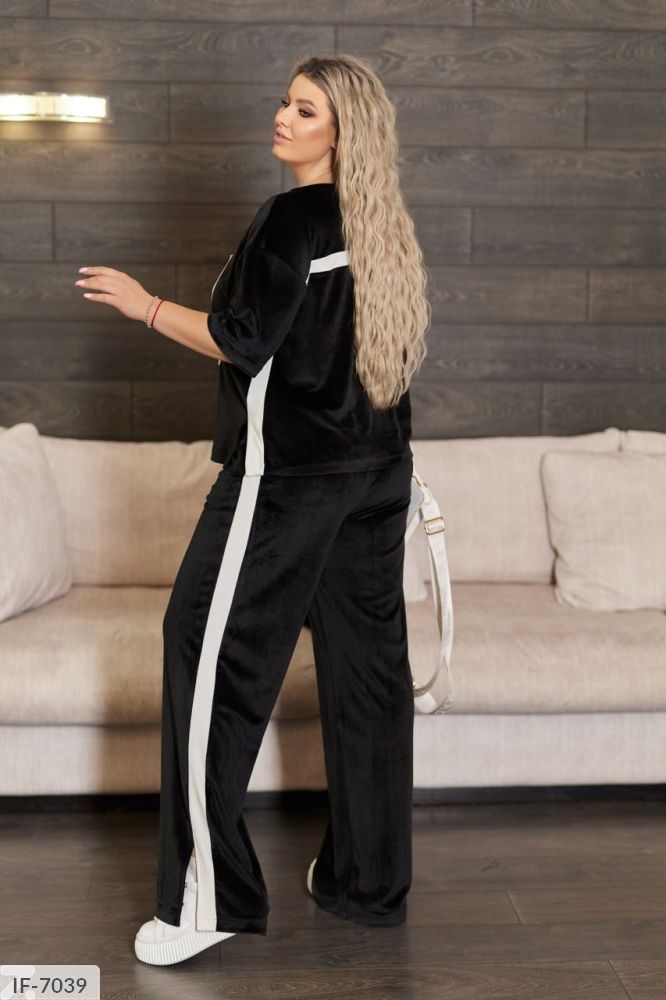 Футболка вільного крою з боків-лампаси, а також по спинці поперек - смужка, на грудях-принт з страз. Штани палаццо, з лампасами і розрізами, високої посадки і з кишенями.