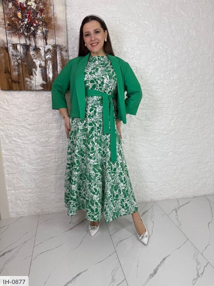 Яскравий комплект: довга сукня вільного крою, до низу волан, жакет без гудзиків, рукав 3/4, ззаду низ на резинці. В комплекті пояс з льону (в колір жакета )