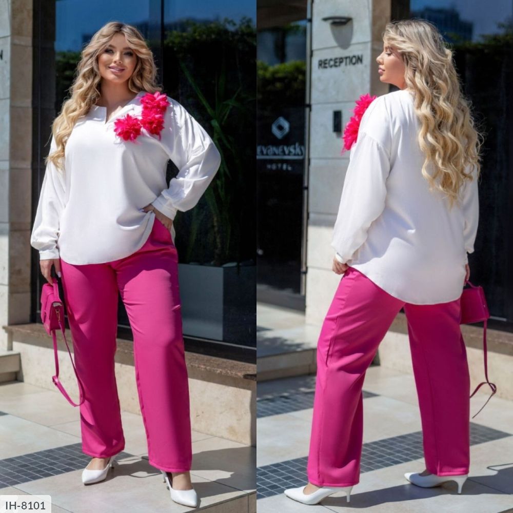 Блузка вільного крою, прикрашена брошкою (квітами під колір брюк), блузка з довгими рукавами.