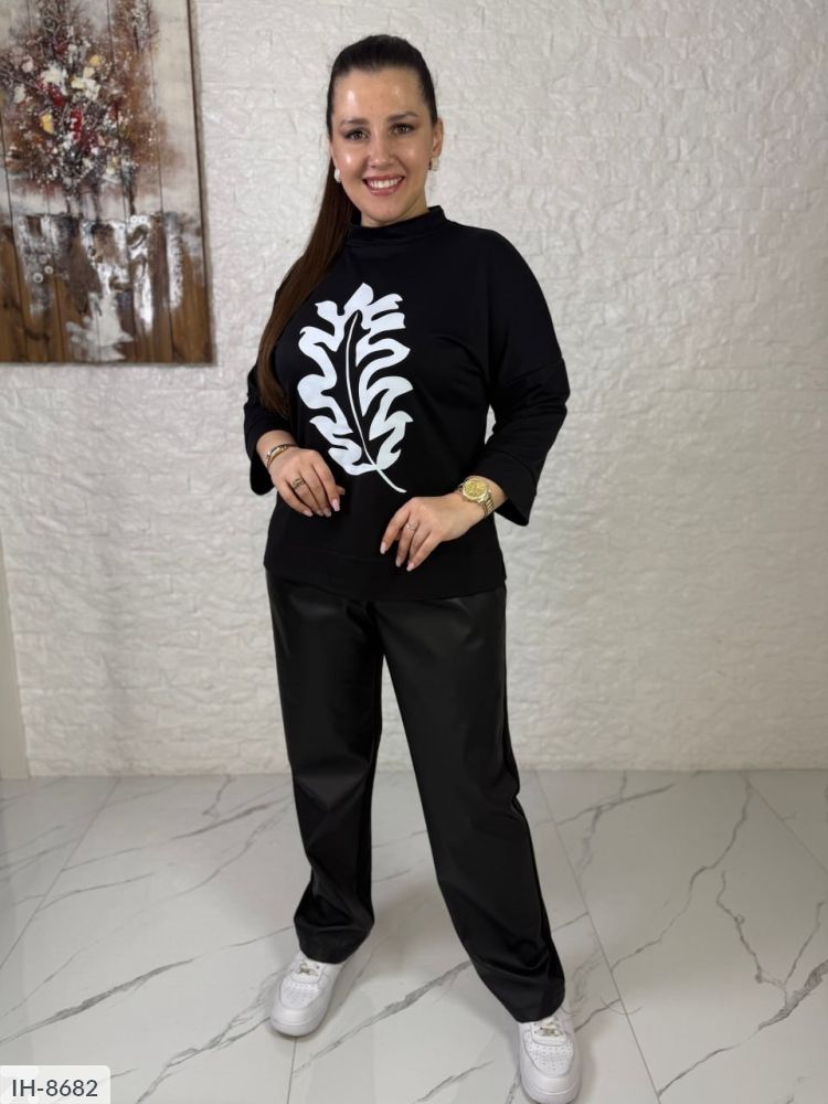 Стильний костюм-двійка хорошої якості. Передня частина штанів виконана з якісної екошкіри, задня з двухнитки хорошої якості. Кофта виконана з двухнитки, яка не покашлатится і прослужить не один рік. Спереду якісний накат, рукав 3/4, комір-стійка.