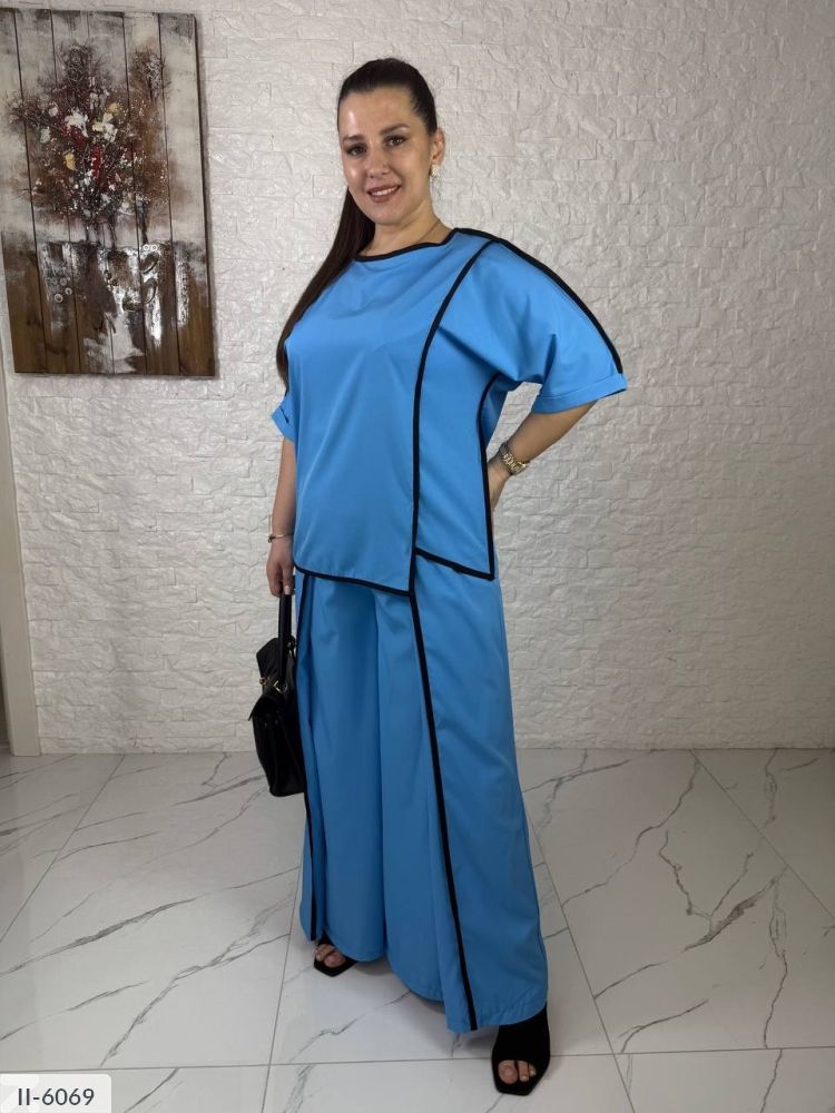 Костюм-двійка цікавого крою: штани імітація спідниці, блуза і штани оброблені кантом, що підкреслює вашу фігуру і робить подовженим силует. Штани-кльош на резинці, висока посадка, спереду нахлест. Блуза з нерівним низом, рукав прикриває лікоть.