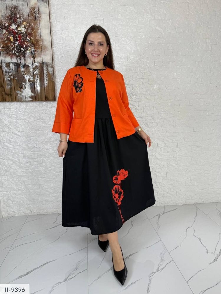 Довга сукня, на спинці блискавка, рукав до ліктя, з боків кишені. Жакет застібається на гудзики в колір жакета, рукав на манжеті нижче ліктя (3/4), з боків кишені.
