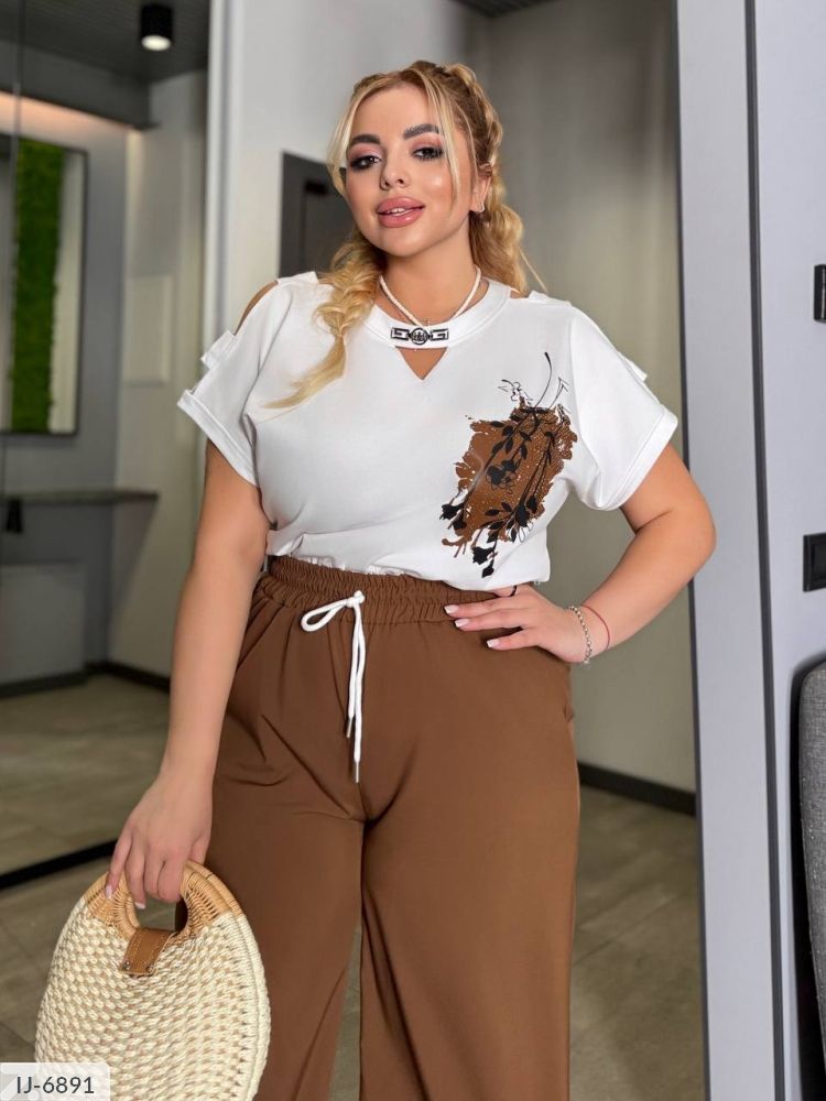 Костюм-двійка, футболка цікавого крою: на плечах і грудях дірочки, пришивна прикраса, рукав до ліктя, на грудях накат в колір брюк. Штани-кльош, вільного крою, з боків дві кишені, талія на широкій резинці, фіксується канатом, ззаду імітація кишень