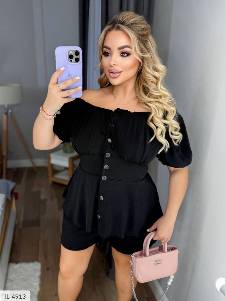 Подовжена блуза: відрізна талія, від талії вільного крою, застібається на прозорі ґудзики. Горловина регулюється куліскою на канаті ( можна затягнути на грудях або розпустили та оголити плечі ). Рукава на резинці. На грудях збірка, що додає додатково шарму моделі. На спинці завязки у вигляді корсету, можна регулювати обєм талії та грудей.
