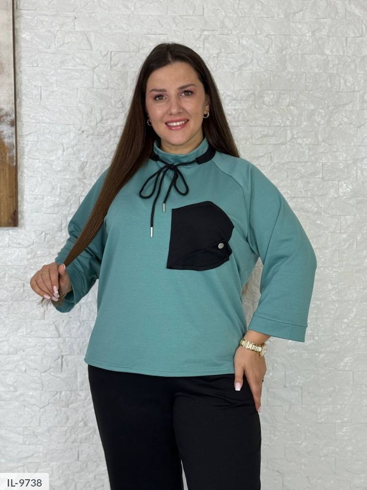 Костюм-двійка виконаний з якісної двонитки. Вільна кофта, гарний канатик на горловині, та декоративна кишеня на кнопці. Штани на резинці