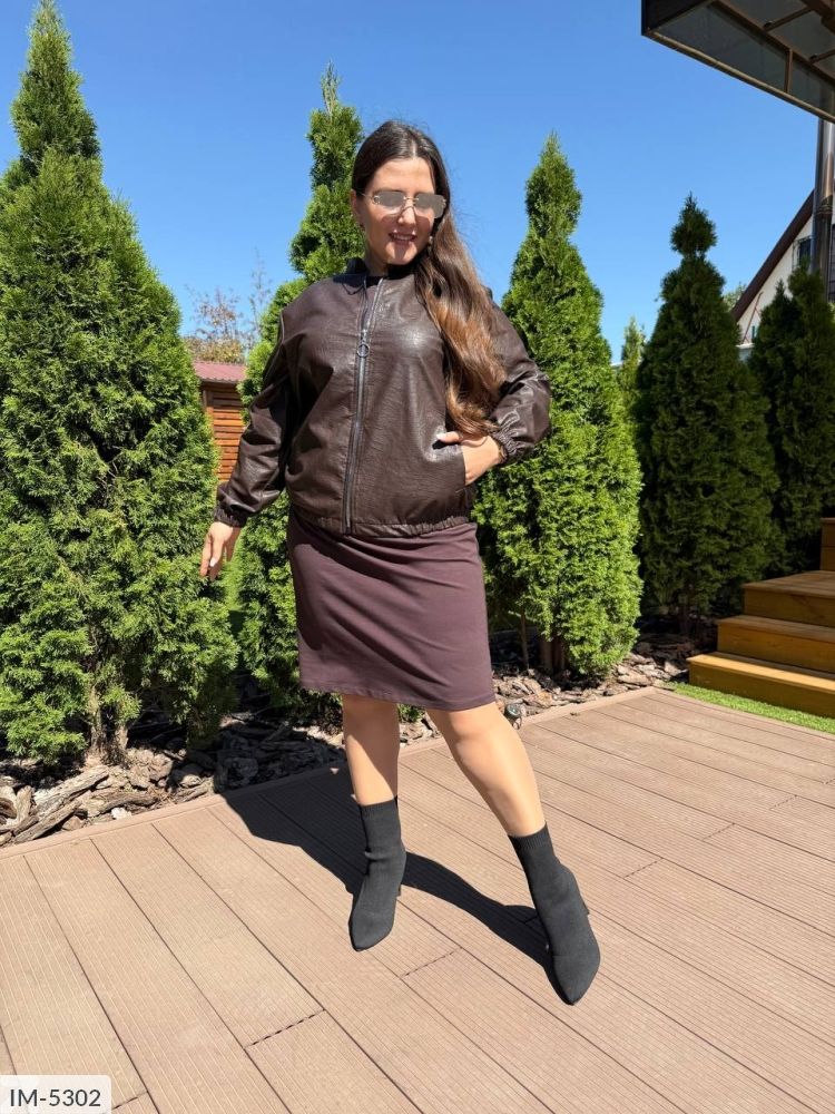 Стильний костюм -двійка: курточка виконана з оригінальної екошкіри ( дизайн пітон, як на відео та фото, якісна, мяка тканина, не потріскається), застібається на молнію з гарним кільцем, довгий рукав та низ куртки на резинці, ворот-стійка, куртка без підкладки, плаття вільного крою, короткий рукав до ліктя, з боків вставки з екошкіри, з якої виконана курточка.