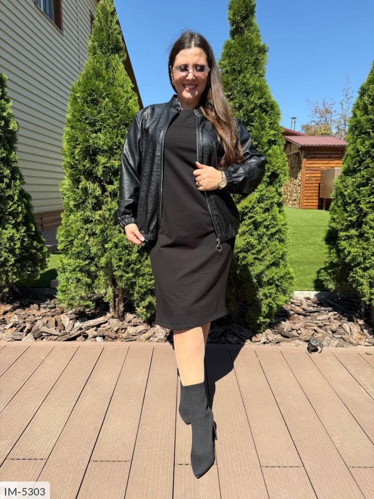 Стильний костюм -двійка: курточка виконана з оригінальної екошкіри ( дизайн пітон, як на відео та фото, якісна, мяка тканина, не потріскається), застібається на молнію з гарним кільцем, довгий рукав та низ куртки на резинці, ворот-стійка, куртка без підкладки, плаття вільного крою, короткий рукав до ліктя, з боків вставки з екошкіри, з якої виконана курточка.