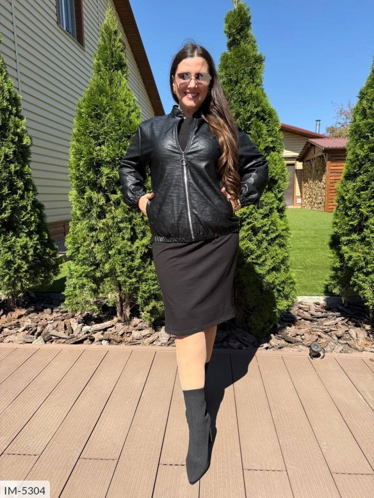 Стильний костюм -двійка: курточка виконана з оригінальної екошкіри ( дизайн пітон, як на відео та фото, якісна, мяка тканина, не потріскається), застібається на молнію з гарним кільцем, довгий рукав та низ куртки на резинці, ворот-стійка, куртка без підкладки, плаття вільного крою, короткий рукав до ліктя, з боків вставки з екошкіри, з якої виконана курточка.