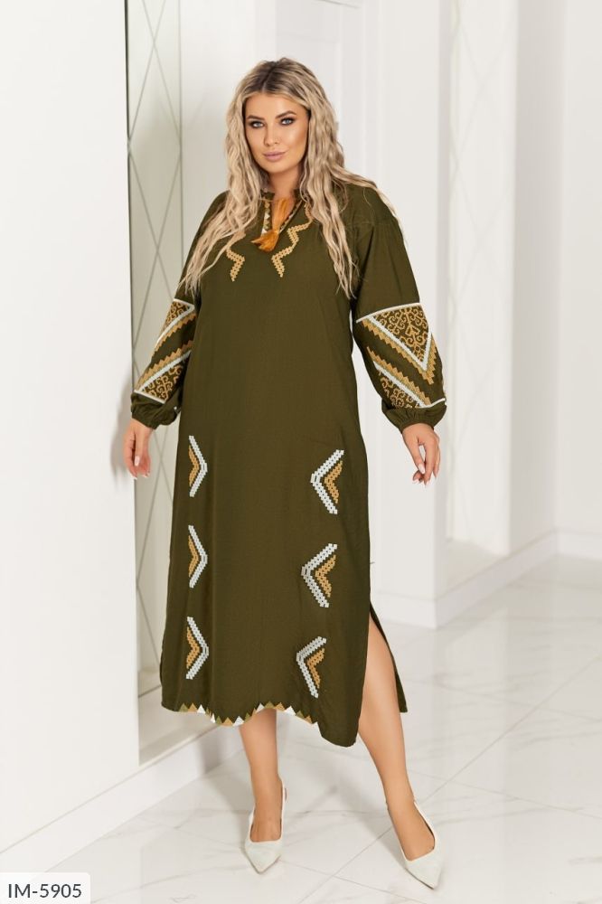 Плаття гарно розшите вишивкою в етно стилі по всій площі спереду, на рукавах та знизу, на шиї невеличкий виріз на завязці у колір вишивки