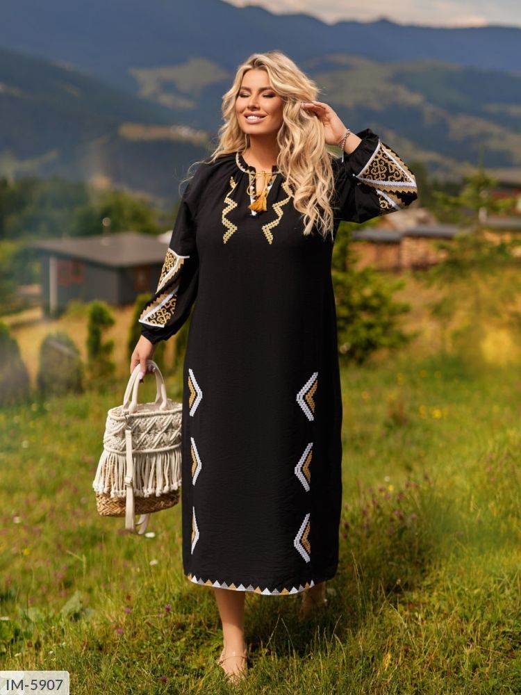 Плаття гарно розшите вишивкою в етно стилі по всій площі спереду, на рукавах та знизу, на шиї невеличкий виріз на завязці у колір вишивки