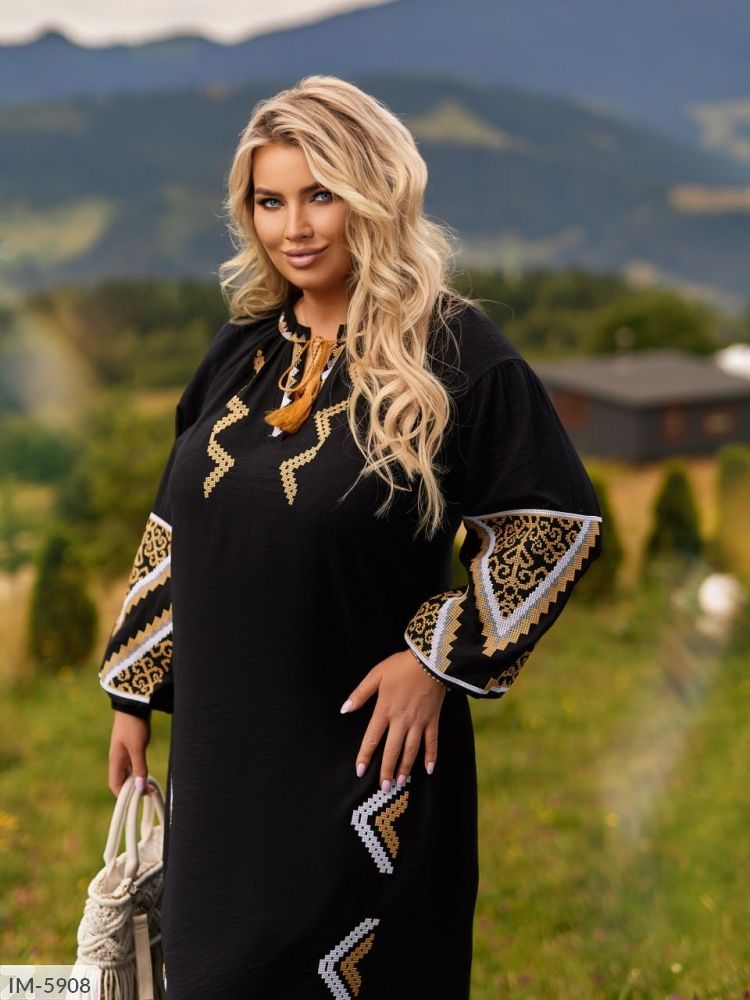 Плаття гарно розшите вишивкою в етно стилі по всій площі спереду, на рукавах та знизу, на шиї невеличкий виріз на завязці у колір вишивки