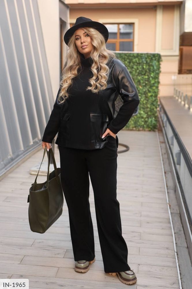 Костюм у стилі кежуал- ідеальне поєднання комфорту та елегантності. Вільний крій забезпечує зручність рухів, а вставки зі штучної шкіри додають образу сучасності та шарму. Мякий трикотаж приємний до тіла, підходить для прохолодної погоди та створює бездоганний силует.
