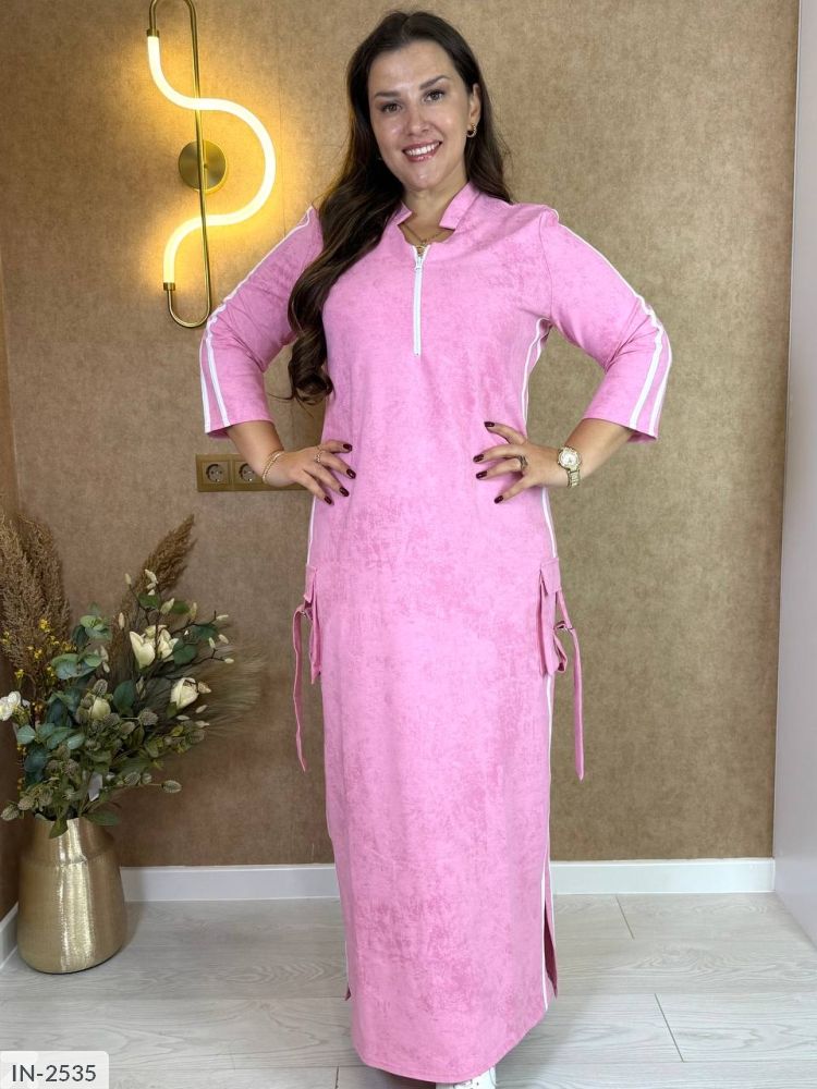Плаття спортивного крою: з боків на рукавах та по фігурі лампаси, по низу розрізи, з боків кишені з металевою пряжкою, на грудях молнія.
