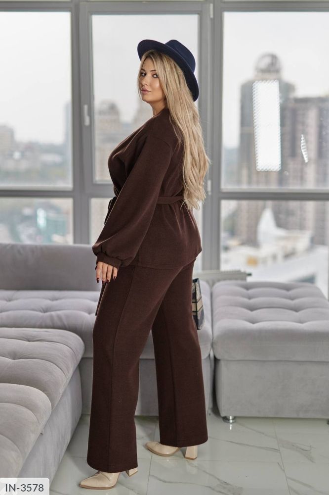 Колір- чорний, шоколад, перлинний, коричневий, смарагдовий, грей. Тканина- ангора - трикотаж двостороння, тепла, тягнеться + 3-5 см. Комплект складається з вільного жакета із запахом і пояса та прямих широких брюк.