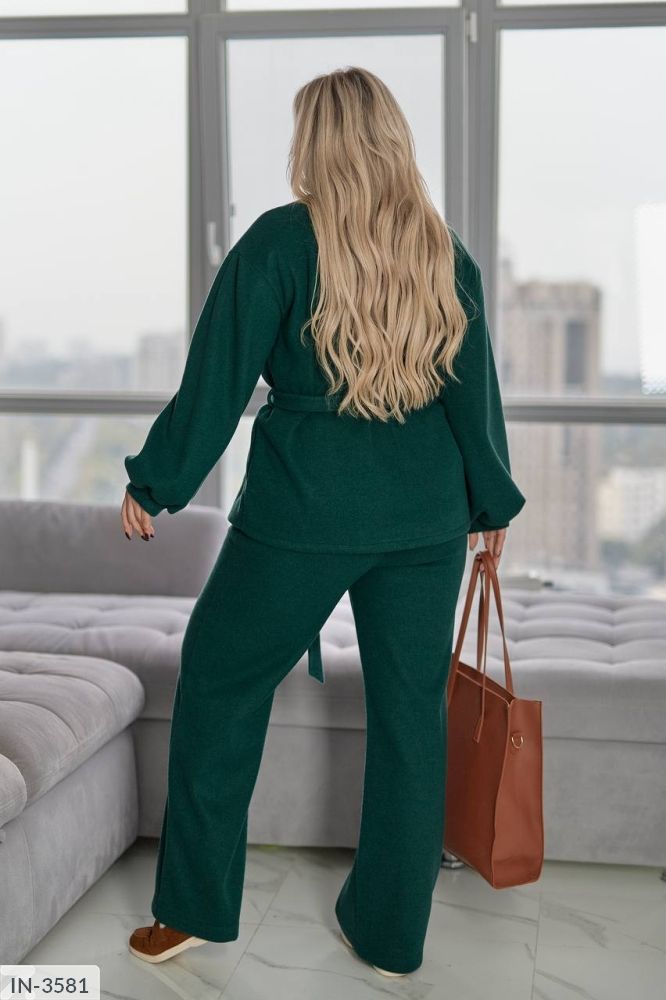 Комплект складається з вільного жакета із запахом і пояса та прямих широких брюк.