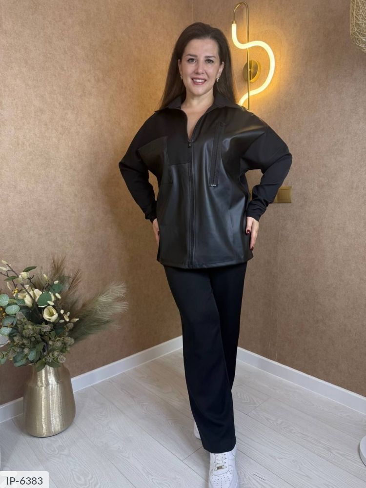 Шикарний костюм-двійка виконаний з крепкостюмки та якісної екошкіри. На грудях декоративна молнія та з іншої сторони робоча кишеня. Кофта на молнії, штани на резинці