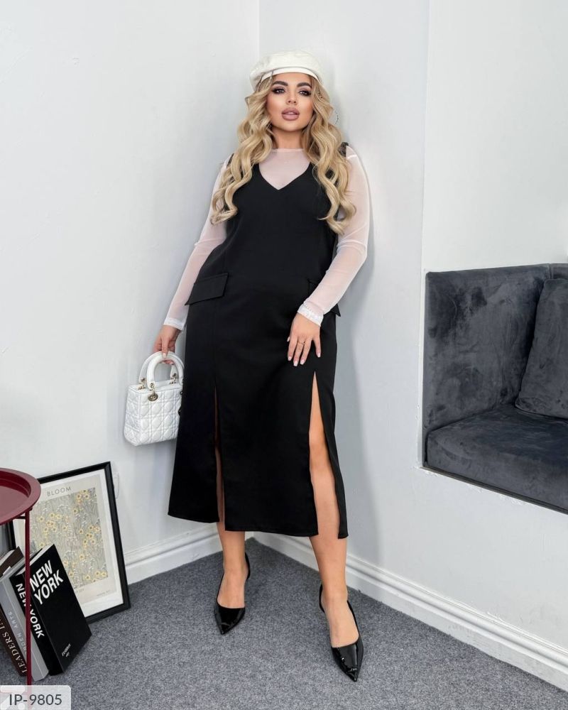 Нарядний комплект: плаття без рукавів, з боків дві кишені -імітації, спереду два розрізи вище колін, v-образний виріз, гольф з довгим рукавом.