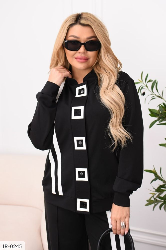 Стильний брючний костюм із еластичної тканини для тих, хто цінує баланс комфорту та елегантності. Лампаси додають динаміки, а геометричний декор (квадрат) на кофті є стильним акцентом. Кофта на ґудзиках по всій довжині із прорізними кишенями. Вільні штани середньої посадки з еластичною гумкою на поясі зручні для повсякденного носіння та поїздок.