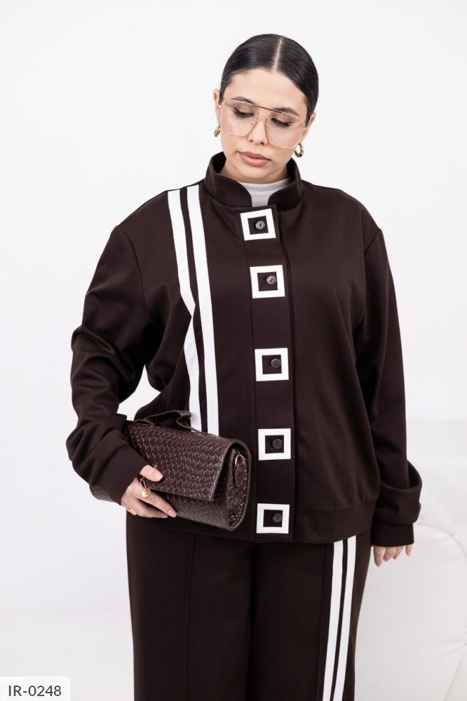 Стильний брючний костюм із еластичної тканини для тих, хто цінує баланс комфорту та елегантності. Лампаси додають динаміки, а геометричний декор (квадрат) на кофті є стильним акцентом. Кофта на ґудзиках по всій довжині із прорізними кишенями. Вільні штани середньої посадки з еластичною гумкою на поясі зручні для повсякденного носіння та поїздок.