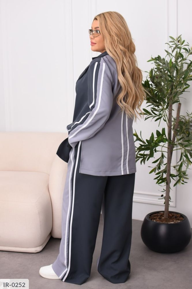 Стильний брючний костюм із костюмної тканини. Комбіновані кольори, лампаси та легкий оверсайз роблять образ сучасним та виразним. Ідеальний для міських прогулянок, подорожей та виходів у стилі smart casual. Піджак застібається на кнопку, має прорізні кишені із клапанами, вільні штани середньої посадки з еластичною гумкою на поясі комфорту на кожен день без компромісів.