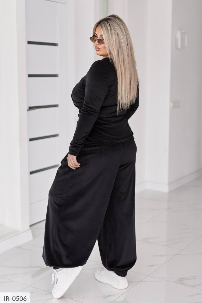 Стильний жіночий костюм у трендових відтінках, що поєднує комфорт і витончену жіночність. Виконаний з мякого, приємного до тіла велюру з легким благородним блиском, який красиво переливається при русі.