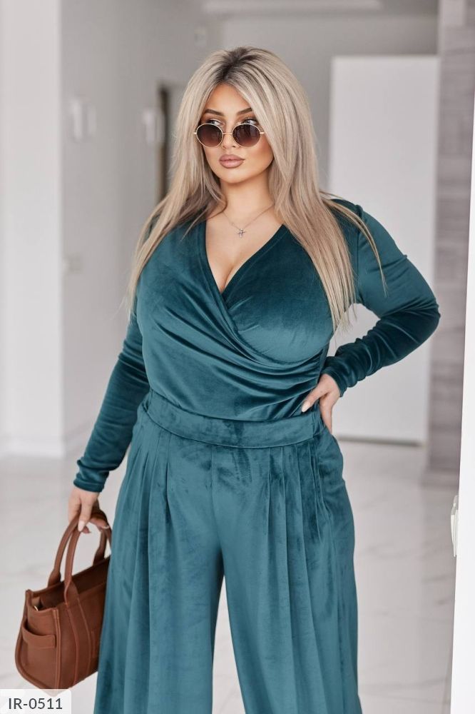 Стильний жіночий костюм у трендових відтінках, що поєднує комфорт і витончену жіночність. Виконаний з мякого, приємного до тіла велюру з легким благородним блиском, який красиво переливається при русі.